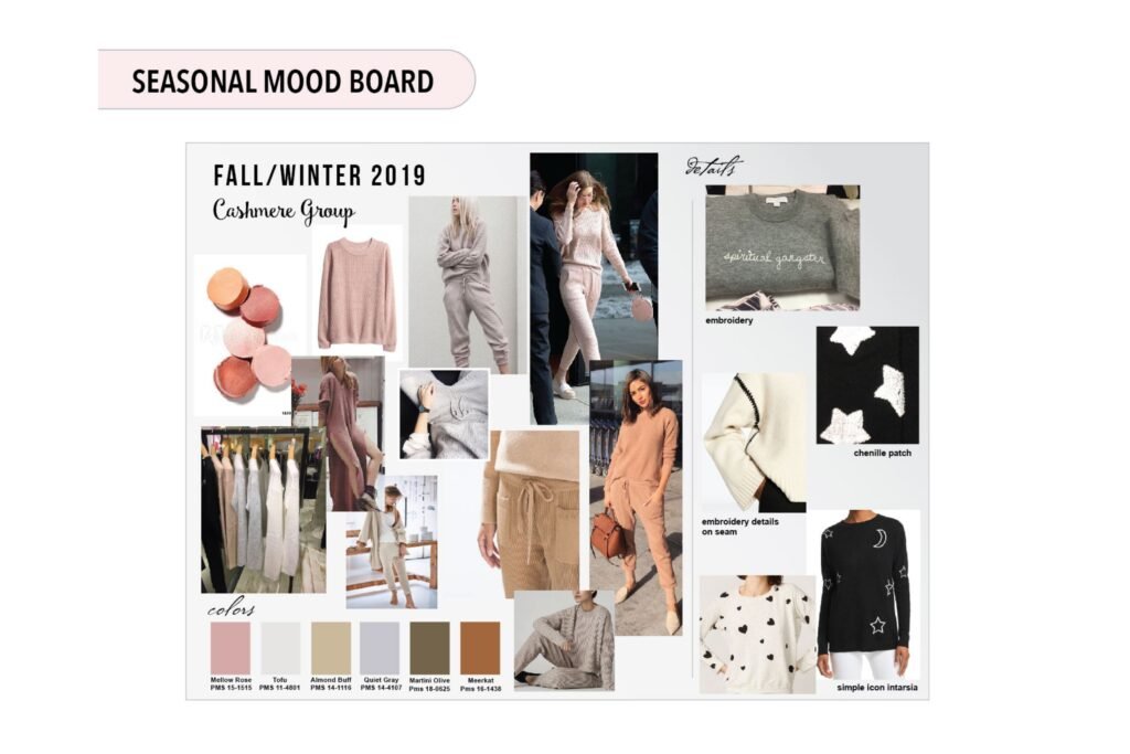 ムードボートという、洋服のスタイル、デザインの方向性、カラーパレット、キーになる装飾デザインやグラフィック、柄などのイメージをテーマに沿ってまとめたボードを作ります。