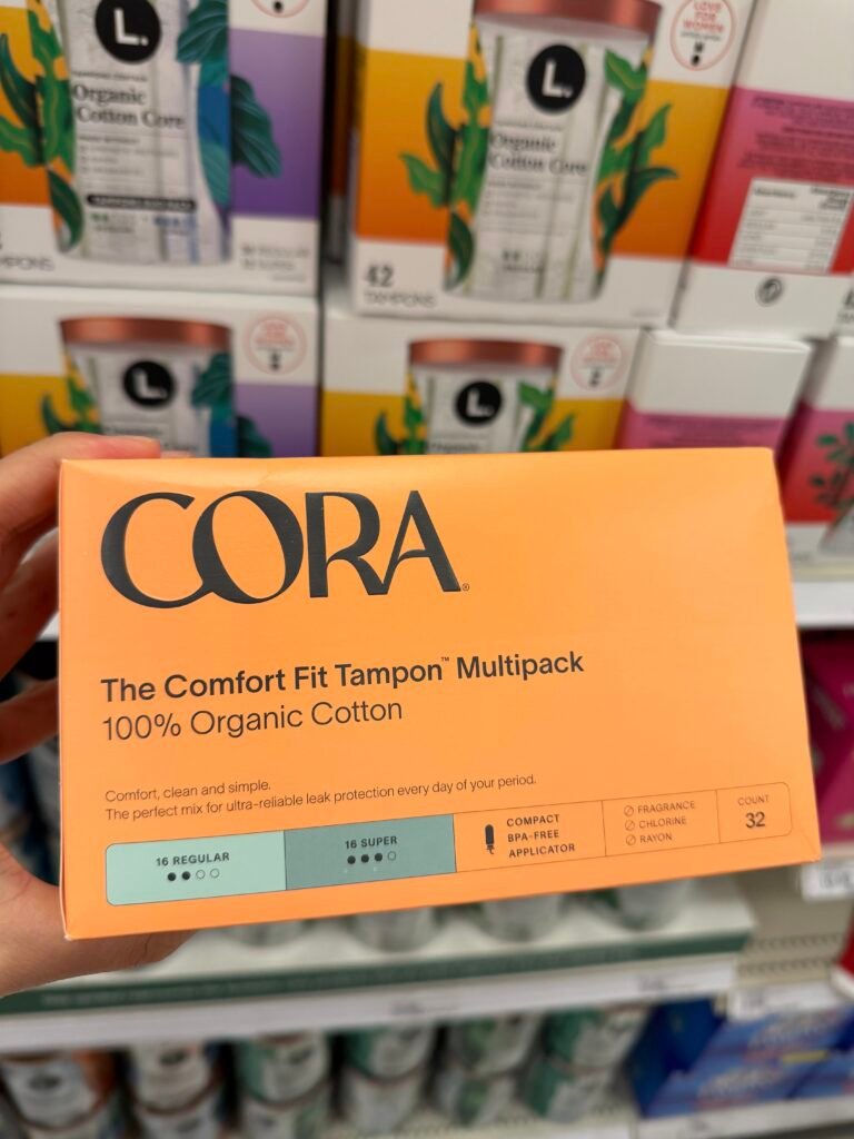 Coraもオーガニックコットン使用、漂白剤の塩素使用なし、フレフランスフリーのタンポンとナプキンのラインナップ。