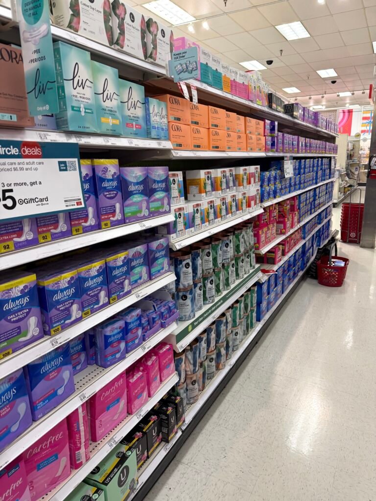 まずびっくりするのが、とにかく生理用品コーナー半端なく広い!特に大型スーパーのTargetなんかへ行くと、一通路、両方の陳列一杯に商品がずらり!!ありすぎて迷う時もある🙀