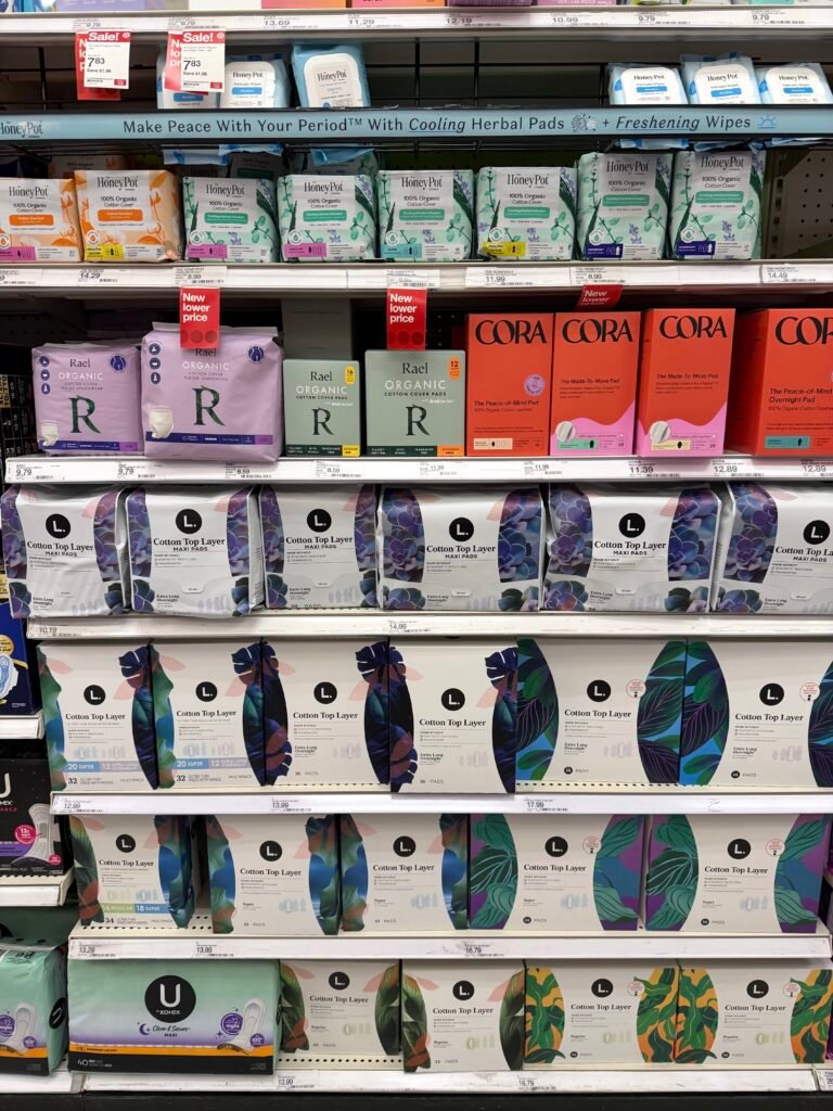 まずびっくりするのが、とにかく生理用品コーナー半端なく広い!特に大型スーパーのTargetなんかへ行くと、一通路、両方の陳列一杯に商品がずらり!!ありすぎて迷う時もある🙀